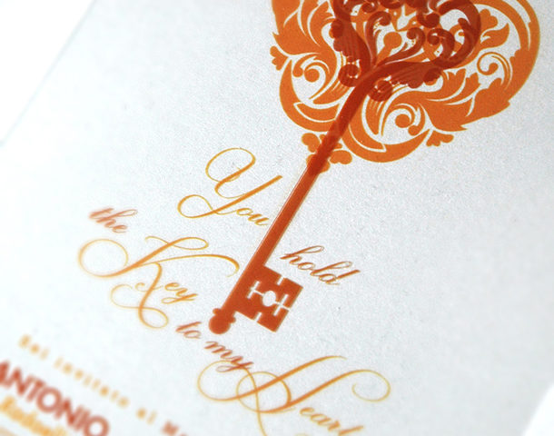 Antonio e Marta sono una coppia con gli occhi accesi di un amore indissolubile, forte, determinato che oltrepassa tormenti e difficoltà senza mai essere scalfito o vinto. La loro passione e il loro amore si fonde quasi a renderli un unico elemento; i loro cuori sono scrigni dei quali solo uno possiede la chiave dell’altro. Per loro è stato pensato un invito che si combina concettualmente e strutturalmente come due pezzi, che sovrapposti si compongono e completano. Il gusto classico e romantico si fonde con una soluzione moderna e inconsueta; la simbologia del cuore e della chiave gioca come elemento distintivo caratterizzando tutti gli elementi della suite grafica.